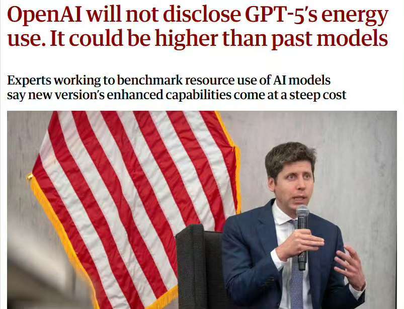 1. 汽車行業不停給出能耗與環保數據,甚至交碳税。人工智能行業已成耗能大户,但卻不給數據!OpenAI很久沒給能耗數據了,包括最新的GPT-5。《衞報》報道,伊利諾伊大學教授 Rakesh Kumar研究了AI的能源消耗,他説GPT-5能耗可能比ChatGPT最初版本多 20 倍。