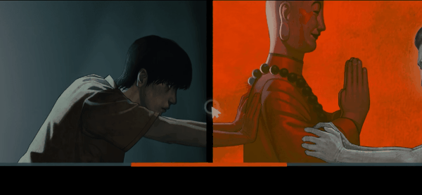 下圖是主角秦小南被人威脅,被迫將一尊內部藏有活人的空心佛像推下懸崖的演出。在推動佛像的過程中,不僅需要玩家手動點擊屏幕助力,秦小南心中每一個關於佛像內活人身份的猜測,也化成了另一端阻止他的手,形成了一種拉扯猶豫的畫面: