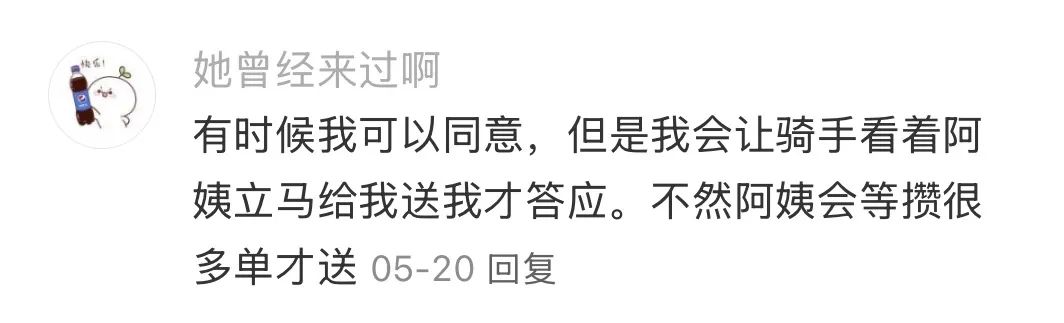 “代送的小學生一單就發車,而阿姨一次要接十來個單子才開始往上送,送到我手裏的時候,外賣都涼了。”