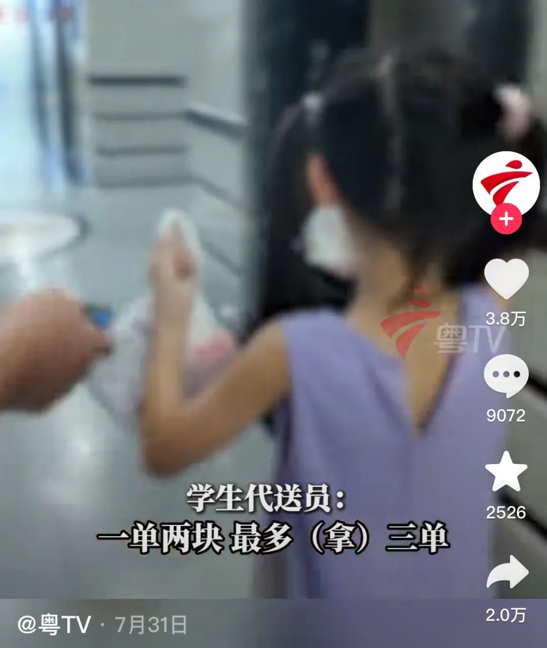 作為外賣代送,這些小孩哥小孩姐只要代替騎手跑完送餐任務的 “最後一百米”,也就是把餐從樓下送到樓上,騎手就會給他們一單1~2塊錢。