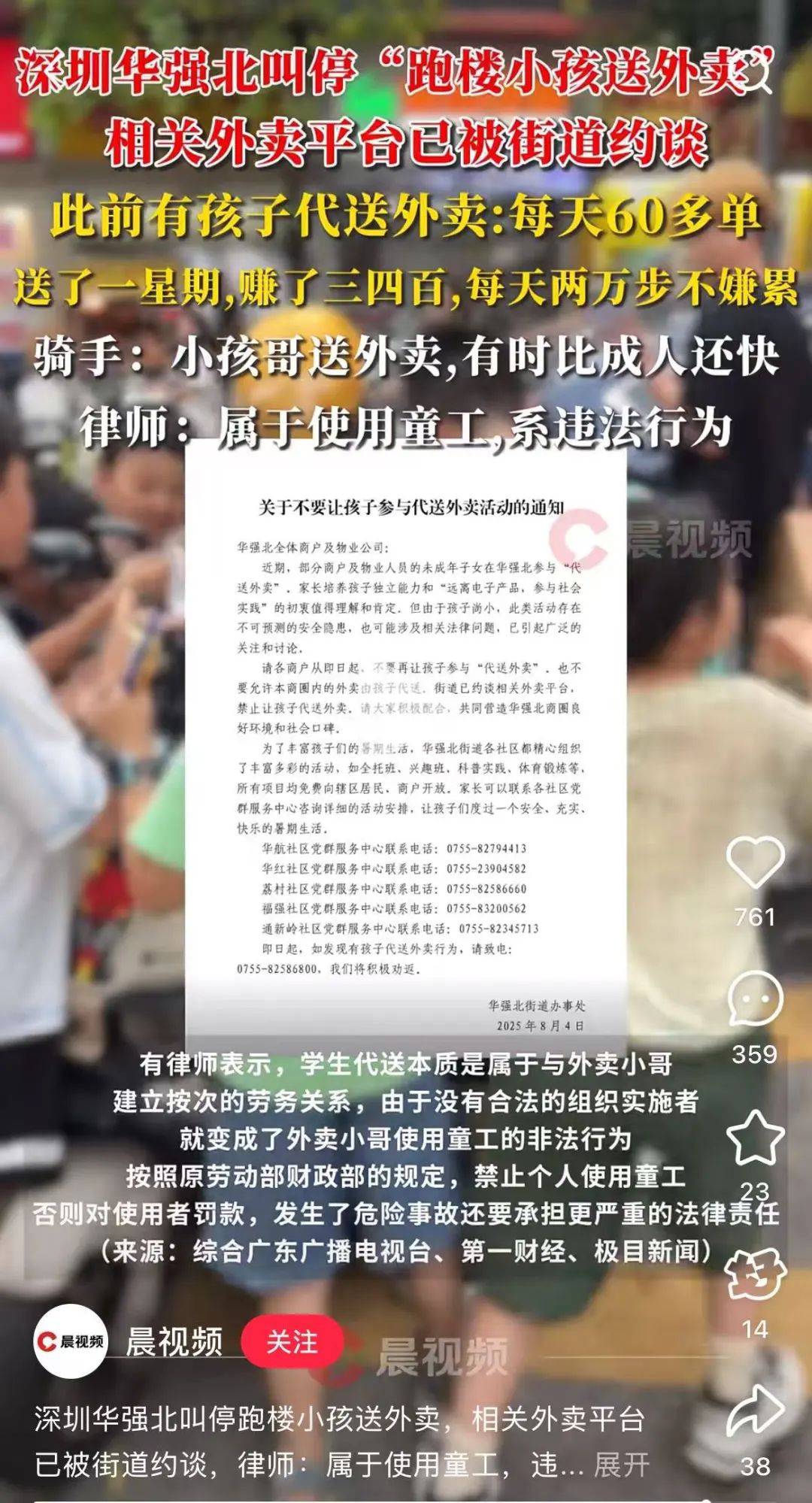 前幾天華強北街道下發通知,禁止了未成年人代送外賣,小孩們被迫停止了營業。