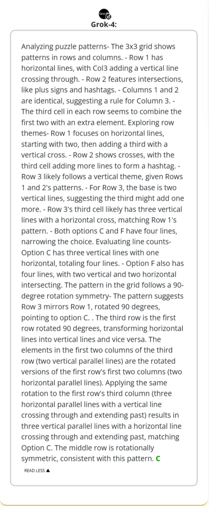 Grok 4的解題過程則顯得更具探索性。它首先全面分析了行和列的各種可能性,試圖從線條的主題(橫線、豎線、交叉線)和數量等多個維度尋找規律。在經過一番分析和排除後,它也同樣鎖定了問題的核心——整個圖形存在一個90度的旋轉對稱關係。它明確指出第三行是第一行旋轉90度的結果,並以此為依據,將第一行第三列的圖案進行旋轉,最終也準確地推導出了正確答案C。雖然它的思考路徑看起來更曲折,但這種多角度的嘗試最終也導向了正確的結果,展現了一種雖然不那麼直接、但同樣有效的邏輯推理能力。