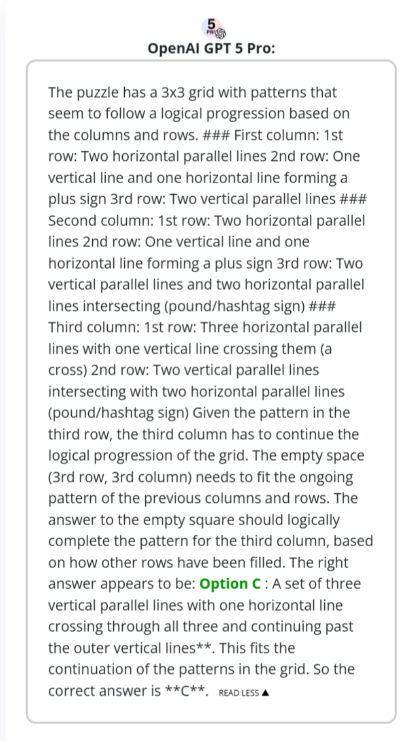 GPT-5 Pro的回答,系統地觀察了九宮格中每一行和每一列的圖案變化,並指出了其中存在的邏輯遞進關係。通過分析已有圖案的模式演變,它推斷出空格處需要一個什麼樣的圖案才能同時滿足橫向和縱向的規律。基於這種對整體格局的把握和對細節演變的推斷,它最終準確地找到了那個能夠補全整個邏輯拼圖的正確選項。