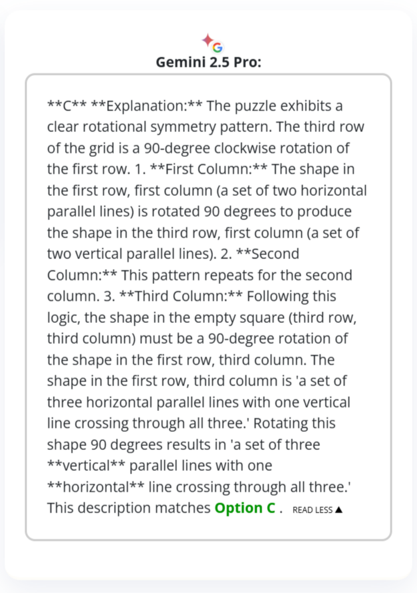 Gemini 2.5 Pro的回答也同樣正確,但它找到了一條完全不同的解題路徑。它敏鋭地識別出了一個清晰的“旋轉對稱”規律,指出整個九宮格的第三行,其實是第一行順時針旋轉90度得到的結果。基於這個簡潔而優雅的規則,它輕鬆地推導出了第三列空格處的圖案,也應該是第一列對應圖案旋轉90度的樣子,從而得出了正確的答案。這展現了其強大的模式識別能力,説明它能夠從不同的維度發現問題的內在邏輯,找到同樣有效但思路迥異的解決方案。
