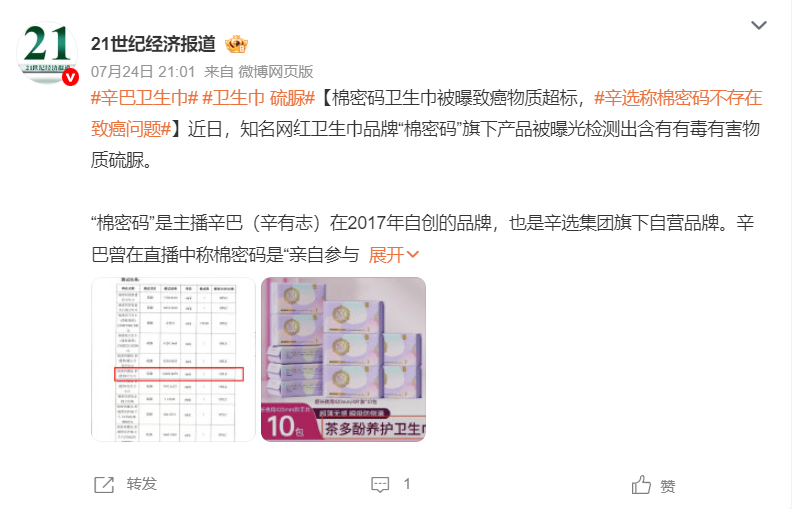 值得一提的是,對於近期備受爭議的棉密碼衞生巾、商品質量等辛選粉絲熱切關注的問題,辛巴在最後一次直播中隻字未提。