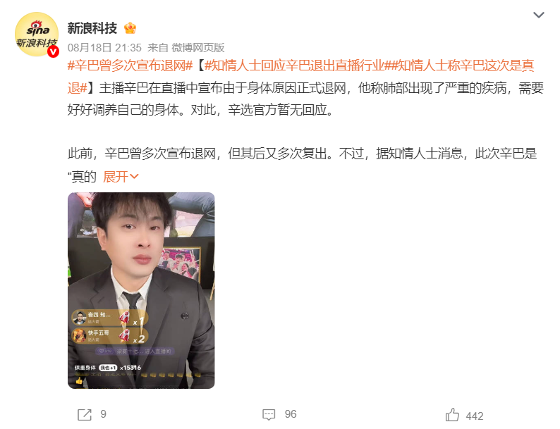 8月18日晚上,主播辛巴在直播中表示,“跟大家做個告別,從今天開始辛巴再無能力承載直播這份工作,今天正式宣佈退出直播行業。”