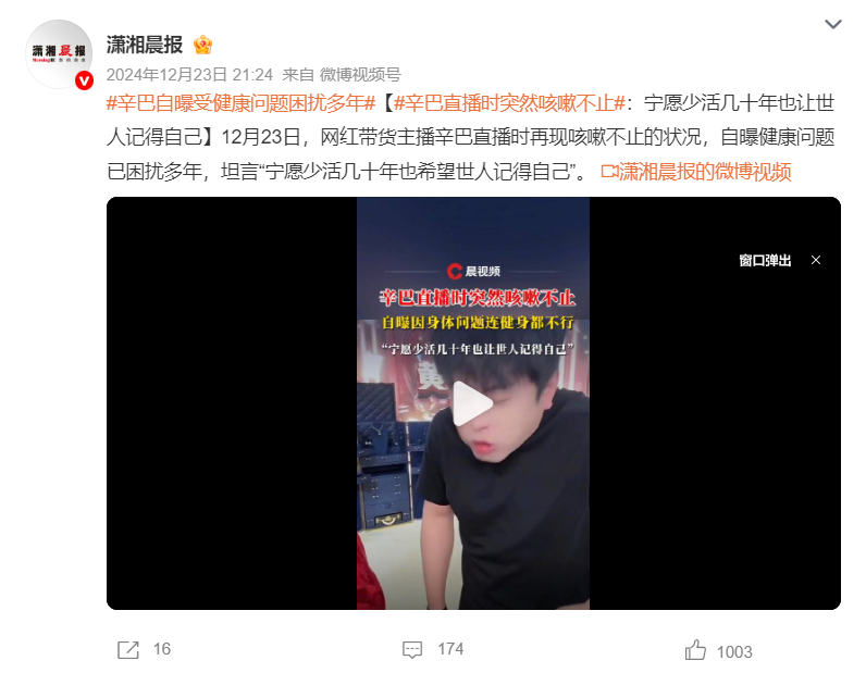 隨後,關於辛巴自曝患病、辛巴身體情況等相關討論登上熱搜。彼時,有網友認為,這又是辛巴為了帶貨“演戲賣慘”,也有網友表示可能是身體真的出現了問題,希望辛巴休息調理,不要太拼。