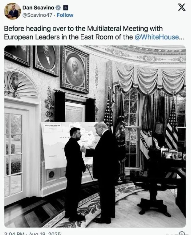 而特朗普的助理丹·斯卡維諾在會談結束後,也在自己的X平台賬號上發了一張特朗普和澤連斯基的合影,這張合影的詭異之處顯示,兩個人正站在特朗普的橢圓形辦公室所展示的烏克蘭地圖跟前,特朗普在説話,而澤連斯基則面無表情地專心聽着。