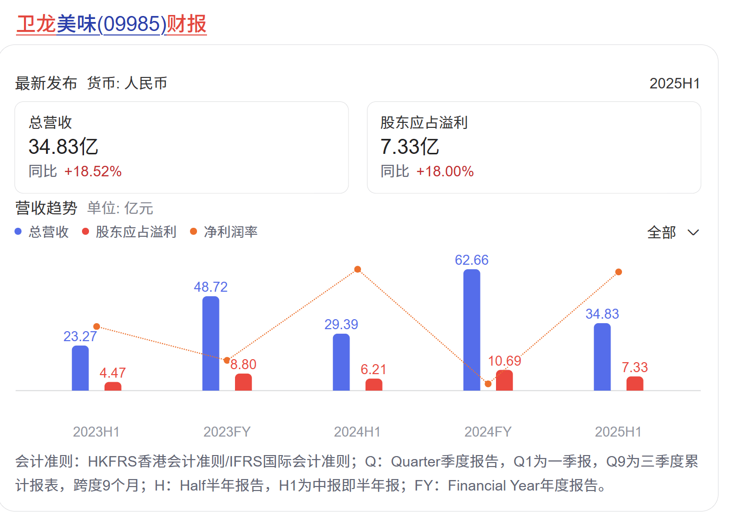 從總體數據看,衞龍實現總收入 34.83 億元,同比上升 18.5%;淨利潤 7.36 億元,同樣同比增長 18.5%。