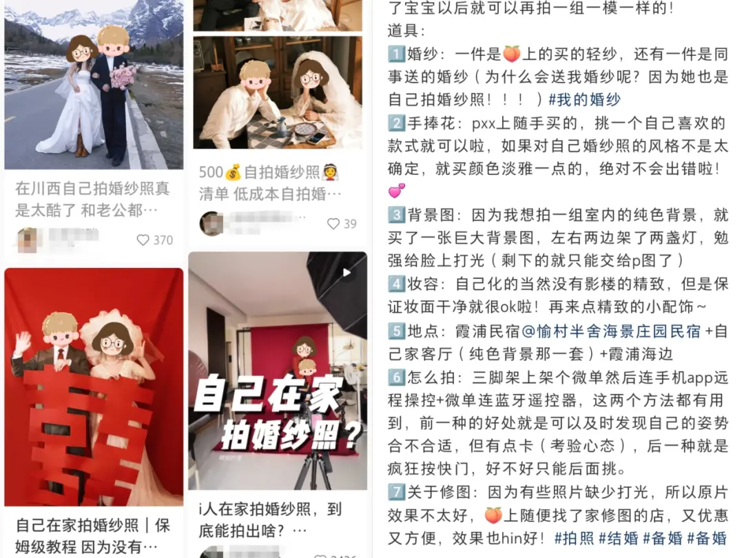 社交平台湧現“自助婚拍”攻略:年輕人自備婚紗、背景布,用低成本、個性化拍攝替代傳統旅拍。(圖/社交平台截圖)