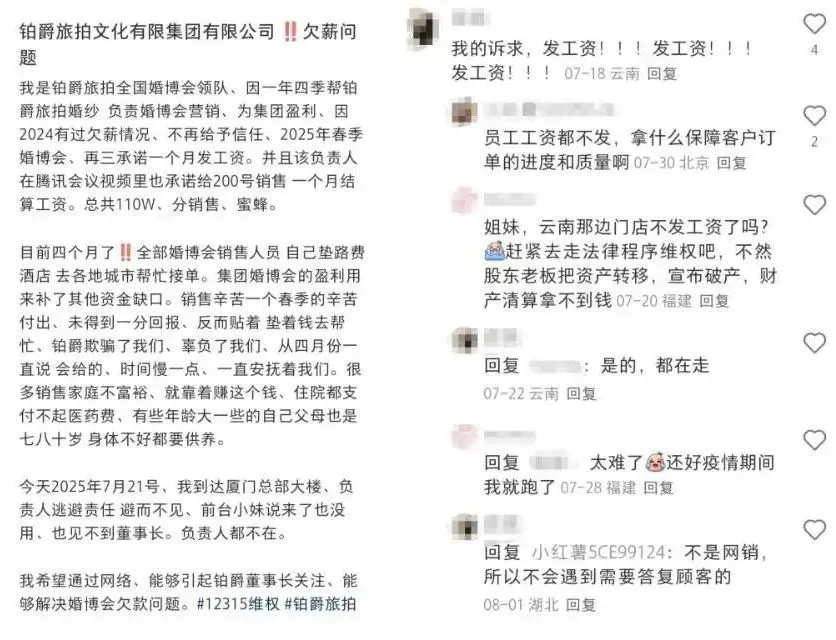 社交媒體上,鉑爵旅拍員工爆料拖欠薪資、負責人避而不見等問題。(圖/社交平台截圖)
