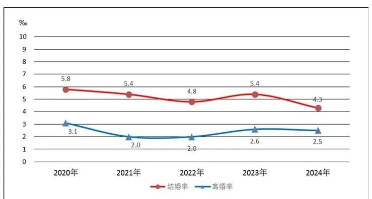 《2024年民政事業發展統計公報》數據顯示:2020——2024年結婚率持續下滑,從5.8‰降至4.3‰。(圖/民政部官網)