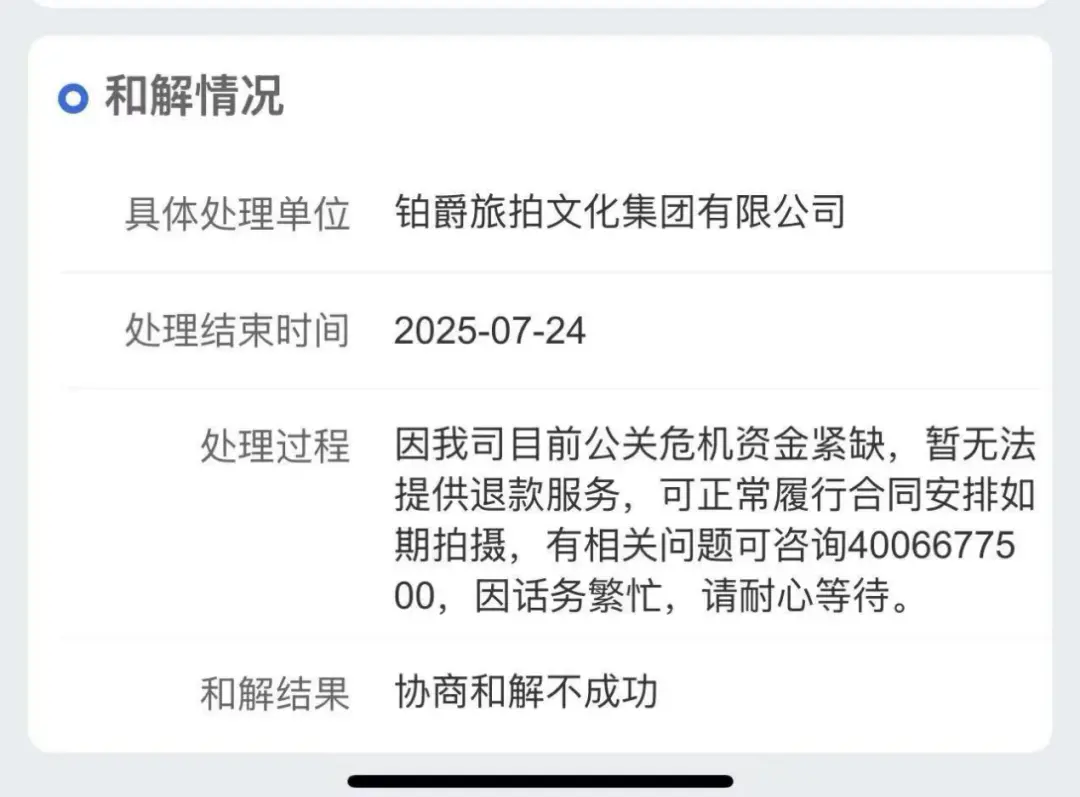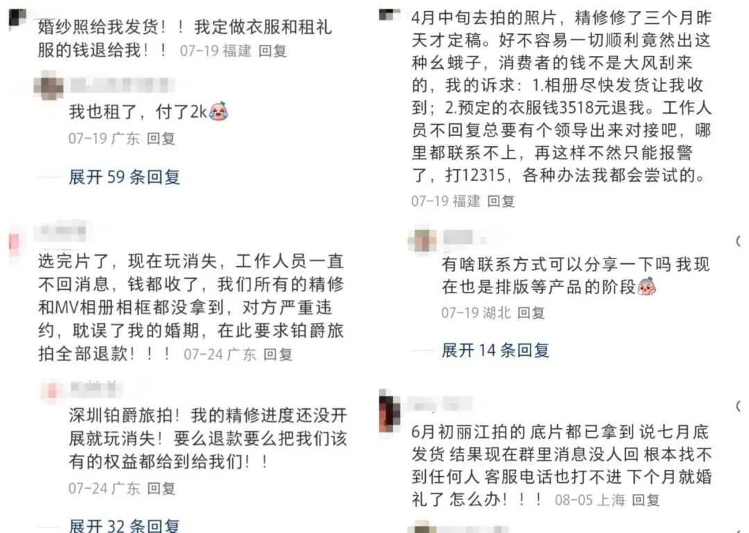 但這一消息在互聯網上引起了廣泛的關注。特別對於那些在鉑爵旅拍支付了部分費用、滿懷期待準備開啓浪漫旅拍的新人來説,這是一記猝不及防的重錘。