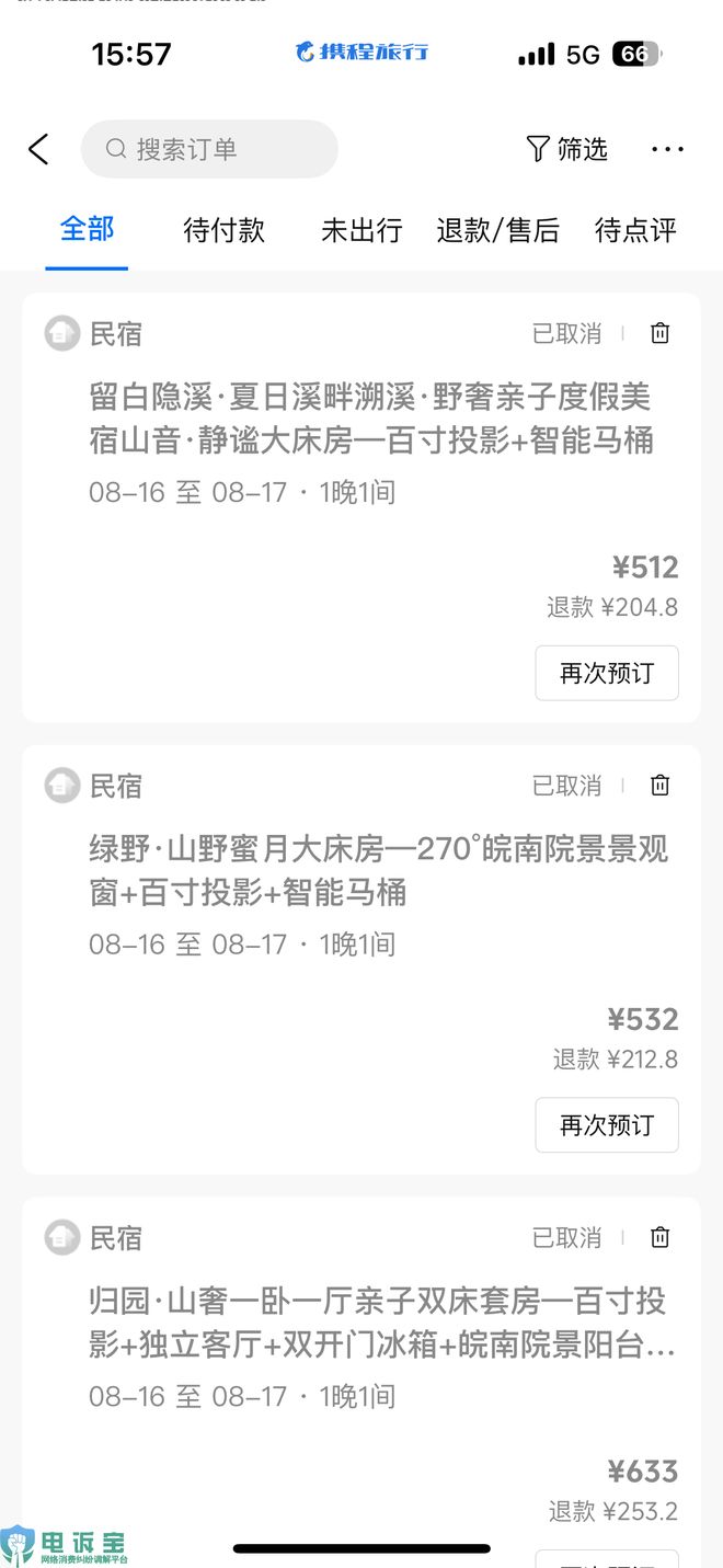 8月16日,江蘇省的胡女士向電訴寶投訴稱其於8月3日在攜程平台預訂了5間月亮灣留白民宿的訂單,計劃8月16日入住,總金額3501元。後因孩子身體不適取消行程,但忘記退訂攜程訂單,直至入住當天上午才接到民宿電話提醒,隨即申請退款。經協商,民宿僅同意退還40%費用,攜程補償800元,胡女士仍需承擔1300.6元損失。