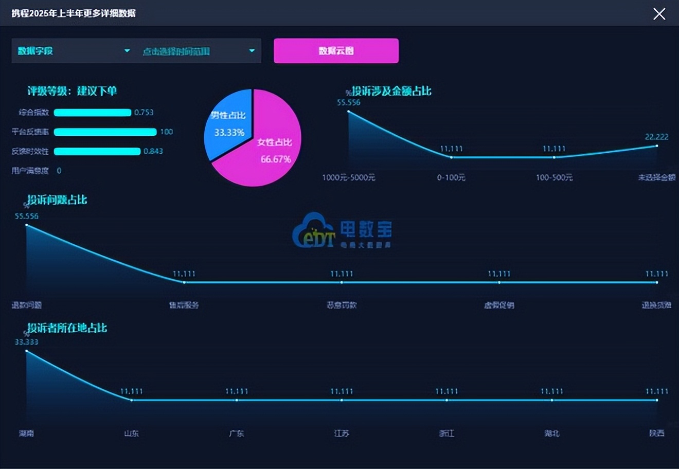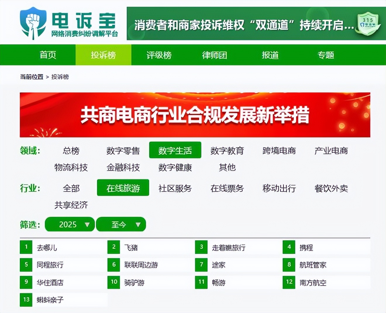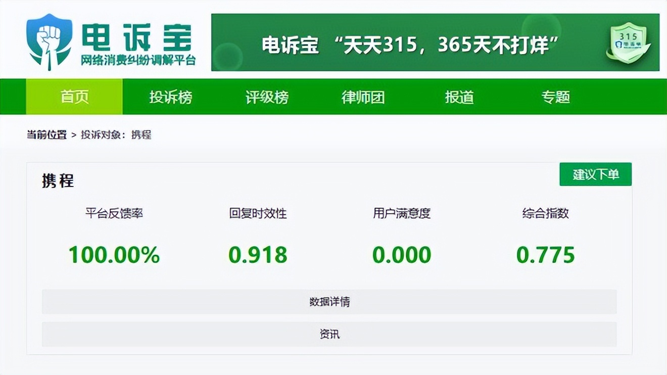 2025年至今,“電訴寶”受理投訴中涉及的在線旅遊領域用户有效投訴顯示(依據投訴量排行),“攜程”排名第4位。最新評級為**“建議下單”**。