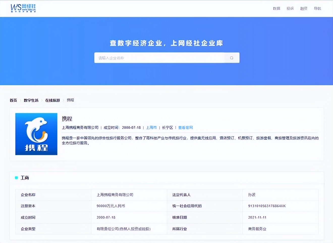 據網經社企業庫顯示,“攜程”屬於上海攜程商務有限公司,成立於2000年,法定代表人為孫波。