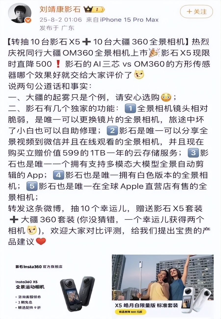 影石的反擊迅速、高調。就在大疆新品發佈次日的凌晨,影石CEO劉靖康便在個人微博上發文,一面大度地向“新玩家”大疆表示“祝賀”,為大疆的起霧問題做了解釋,一面話鋒一轉,表達“歡迎競爭,讓市場更繁榮”的態度,並宣佈將自家的王牌新品Insta360X5降價500元,同時帶着“不怕比”的態度,將Osmo360和影石X5一起加入了抽獎組合。