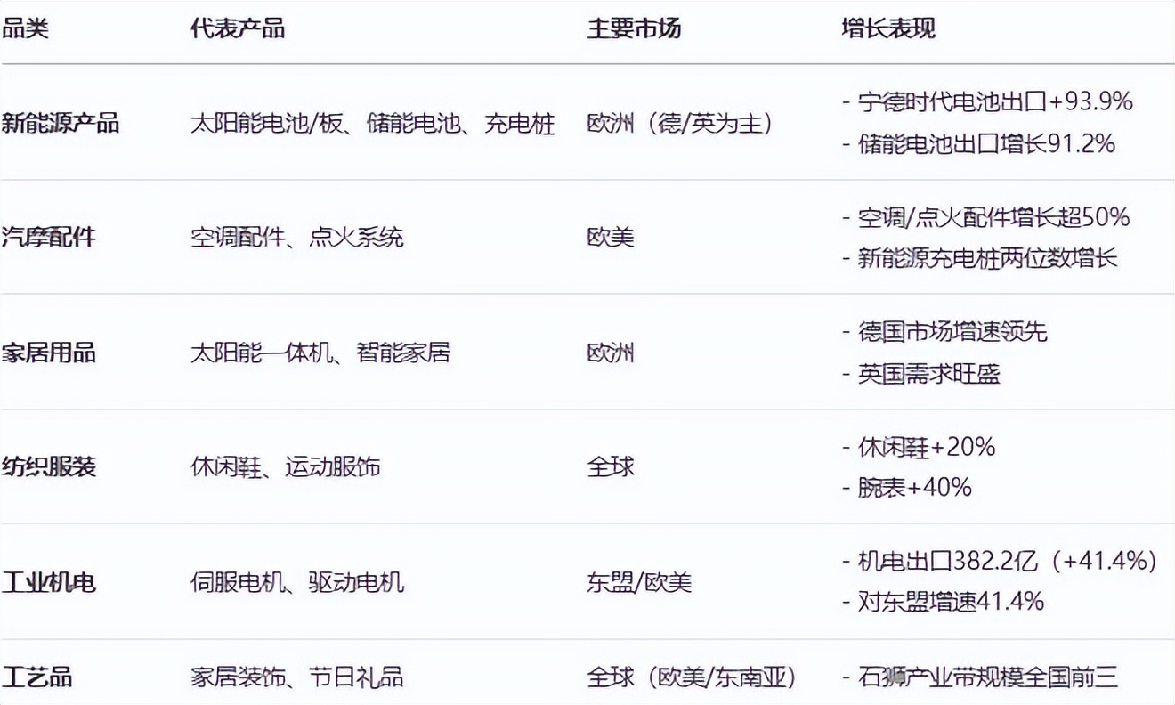 **新能源產品:**太陽能電池、太陽能板、逆變控制一體機等新能源產品在歐洲市場備受歡迎。福建賣家在德國銷售的新能源充電樁品類同比兩位數增長。根據中國汽車動力電池產業創新聯盟數據,2025年一季度我國動力和其他電池(“其他電池"主要為儲能電池)合計出口量同比增長91.2%,達61.5GWh。寧德時代電池出口量同比增長93.9%,其中動力電池增長7.9%,儲能電池出口的強勁增速尤為明顯。