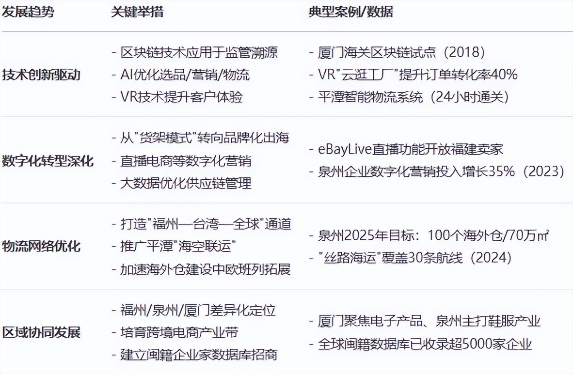 **人才培養政策:**福建省出台了一系列支持跨境電商人才培養的政策措施。支持市屬高校開設跨境電商專業,建立跨學科人才培養體系。舉辦創新創業大賽,鼓勵院校與企業合作,構建複合型人才培養體系。繪製人才能力圖譜,創新政企協同機制,做好人才全週期服務,將跨境電商人才納入高層次人才範疇,吸引優秀人才來榕就業創業。eBay與福建商學院共建跨境電商學院,培養跨境電商人才。“廈品出海"計劃2024年設立10億元跨境電商基金,扶持1000家中小微企業做獨立站,曾一季度誕生32個千萬級品牌。