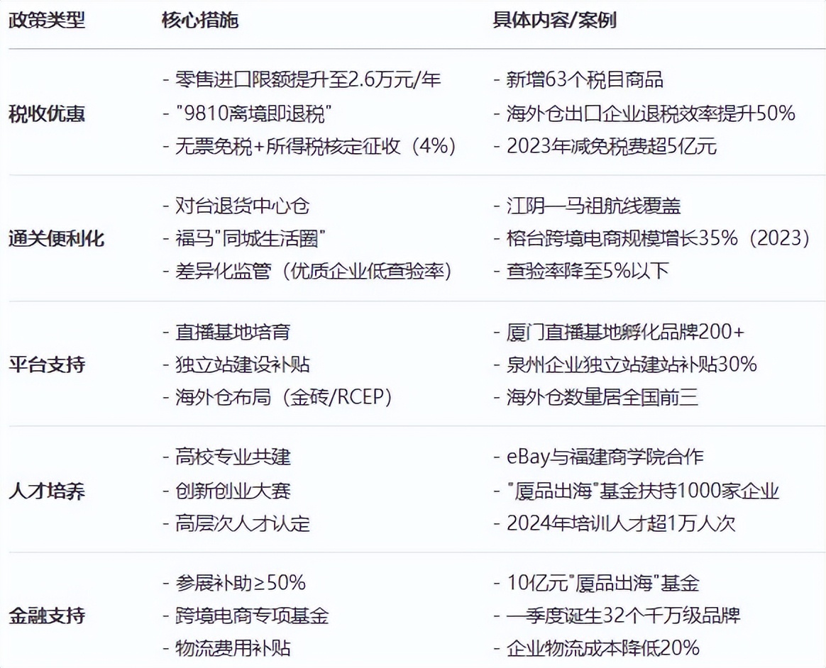 **金融支持政策:**福建省鼓勵各地對企業出境參展展位費給予不低於50%的補助或定額支持,並鼓勵有條件的市、縣(區)可結合實際對展品運輸、統一布展、參展人員機票等其他費用給予補助。“廈品出海"計劃2024年設立10億元跨境電商基金,扶持1000家中小微企業做獨立站。