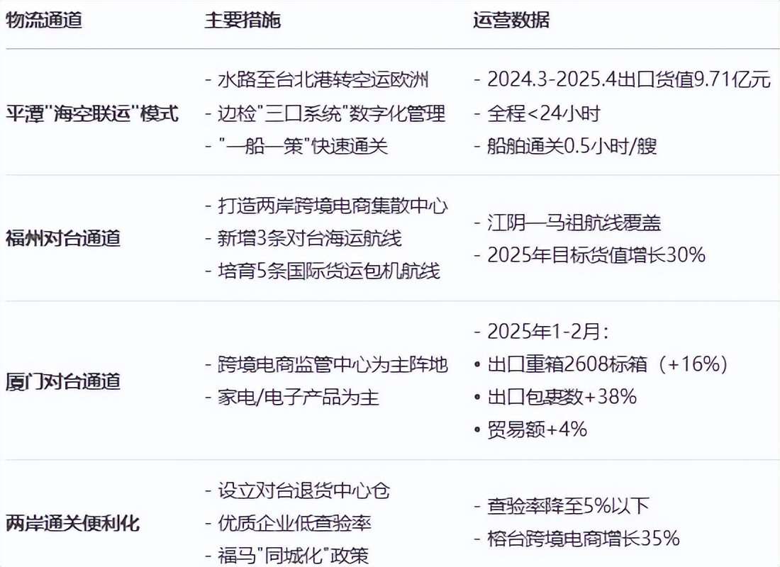 **福州對台物流通道:**福州市出台《中國(福州)跨境電商綜合試驗區高質量發展行動方案(2025—2027年)》,打造兩岸跨境電商集散中心,政策支持範圍擴展覆蓋至"江陰—馬祖"海運航線,實現對台海運差異化發展。推動馬祖、台北清關一體化,鼓勵企業在馬祖設立集貨倉,打造"福州—台灣—全球"跨境電商海、空物流通道。培育5條國際貨運包機航線,2條對台包機航線,新增3條對台海運航線。