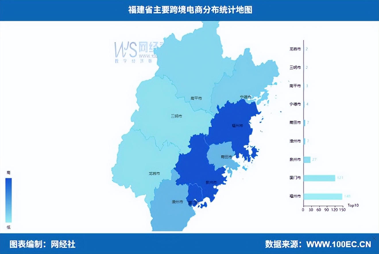 福建省主要跨境電商分佈呈現明顯差異,福州市以148家數量居首,廈門市有121家,泉州市27家,莆田市、漳州市均為7家,寧德市4家,南平市3家,三明市、龍巖市均為2家。