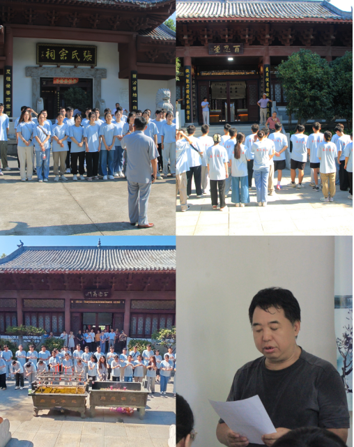 隨後,優秀學子們在祠堂門樓前廣場合影留念。文化組長張建華老師引領大家參觀宗祠,細緻講解祠堂的建設規模、張氏得姓始祖揮公、張集張氏始遷祖旻公以及百忍堂始祖公藝公的歷史淵源與傳説故事,使學子們對家族文化有了更深入的瞭解。