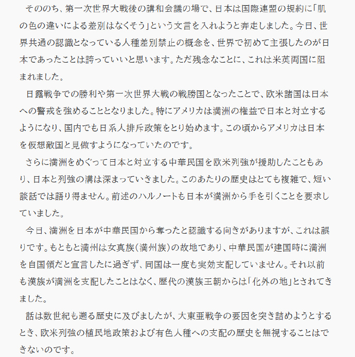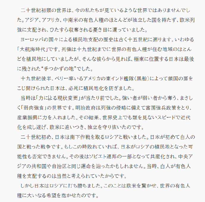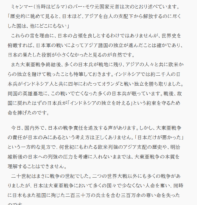 “縱觀歷史,沒有哪個國家像日本這樣,為解放亞洲擺脱白人統治作出如此大的貢獻。”