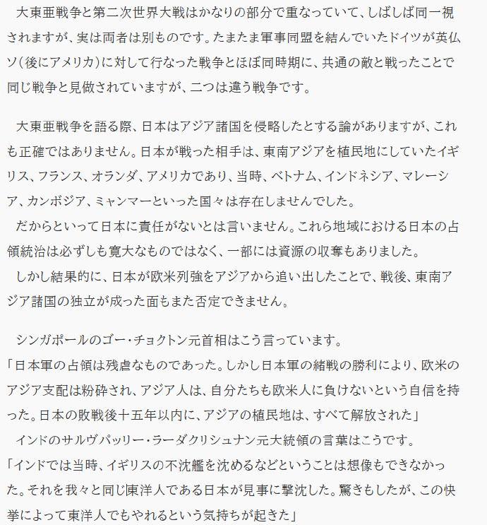 “日軍的佔領是殘酷的,但正因為日軍初期的勝利,粉碎了歐美在亞洲的統治,讓亞洲人產生了‘我們也能與歐美人抗衡’的信心。日本戰敗後十五年內,亞洲的殖民地幾乎全部獨立。”