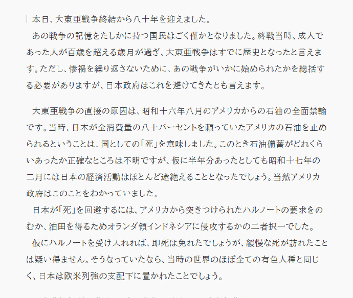 今天,迎來了大東亞戰爭結束八十週年。