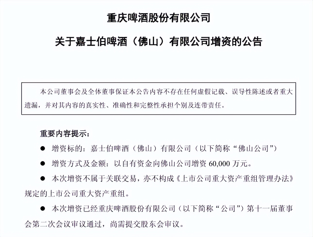 在發佈半年報的同時,重慶啤酒發佈公告稱,為滿足佛山公司的經營發展需要,增強其資本實力,優化其資產負債結構,進一步提升佛山公司持續經營能力和市場競爭力,嘉士伯重慶啤酒有限公司擬以自有資金向佛山公司增資人民幣6億元。本次增資的金額將全部計入佛山公司註冊資本。