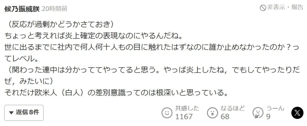 在西方品牌歧視亞裔,搞各種小動作的問題上,日本輿論向來支持中國,甚至可以説是仰仗。