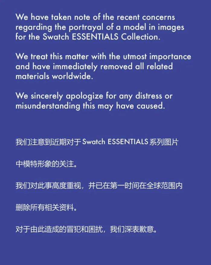 事態發酵後,8月16日,Swatch全球總部發佈道歉聲明。稱已在第一時間,在全球範圍內刪除所有相關資料。