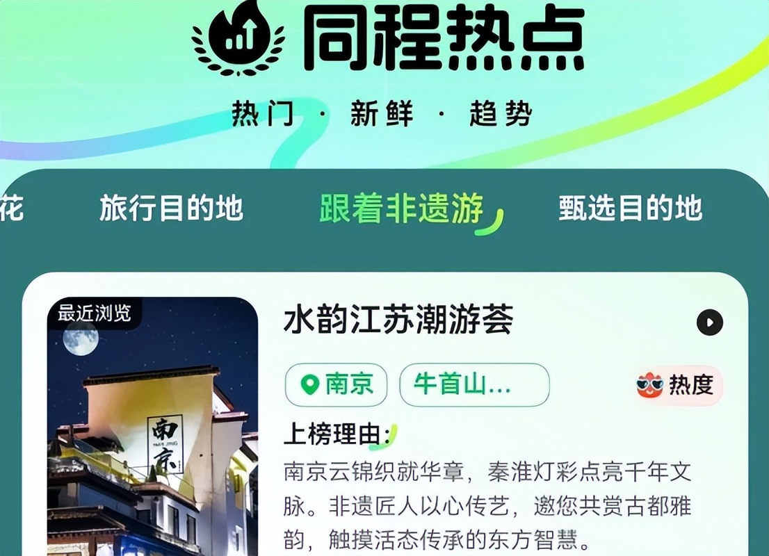比如,“旅遊×非遺”。同程旅行抓住非遺文化旅遊火熱的趨勢,再考慮到Z世代熱衷社交分享的特點,同步發佈“跟着非遺遊”熱點榜單,有效推動文旅資源轉化為消費活力。