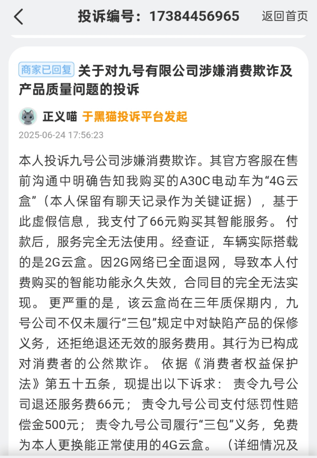 出現此類情況並不難理解,在黑貓投訴平台顯示,九號電動車投訴量近4000條,集中在爆胎、充電困難、藍牙故障、減震效果差等問題。有消費者反映“買車幾天內多次出現ABS故障、顯示屏黑屏”的問題,這暴露出過度追逐智能化時,傳統耐用性、實用性體驗的失守。