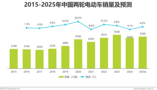 目前,中國電動兩輪車保有量超4億台,市場逐漸從增量市場向存量市場轉變,飽和度進一步加深,根據艾瑞諮詢數據,2025年行業銷量預計達5000萬台,但同比增速已從2020年的接近30%回落至不足5%,對比2024年增速同樣出現斷崖式下滑。