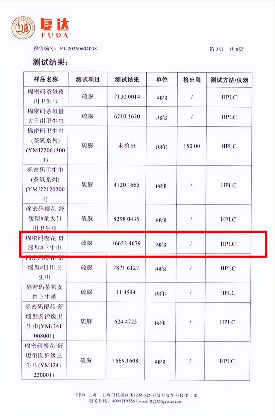 今年5月,**王先生在自媒體上曝光“棉密碼”衞生巾添加硫脲,並組織消費者集體送檢。**上海復達檢測技術集團有限公司出具的檢測結果顯示,10份樣品中有7份檢出硫脲。後續消費者集體送檢發現,2019年至2025年生產的多批次產品含超高濃度硫脲,最高達16653.4679μg/g。而硫脲被列入《危險化學品名錄》,屬於3類致癌物,能通過皮膚滲透進入人體,干擾甲狀腺激素合成,影響多個器官。
