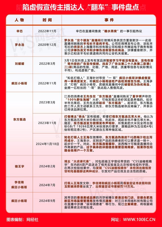 除了辛選衞生巾健康安全問題外,近年來大量網紅品牌翻車連連,網紅達人的自營產品成了消費市場的重災區。據中國商業聯合會直播電商工作委員會副會長單位網經社電子商務研究中心不完全統計,瘋狂小楊哥、辛巴、羅永浩、劉媛媛、東方甄選、駱王宇等知名主播或直播間,均陷入過虛假宣傳風波。