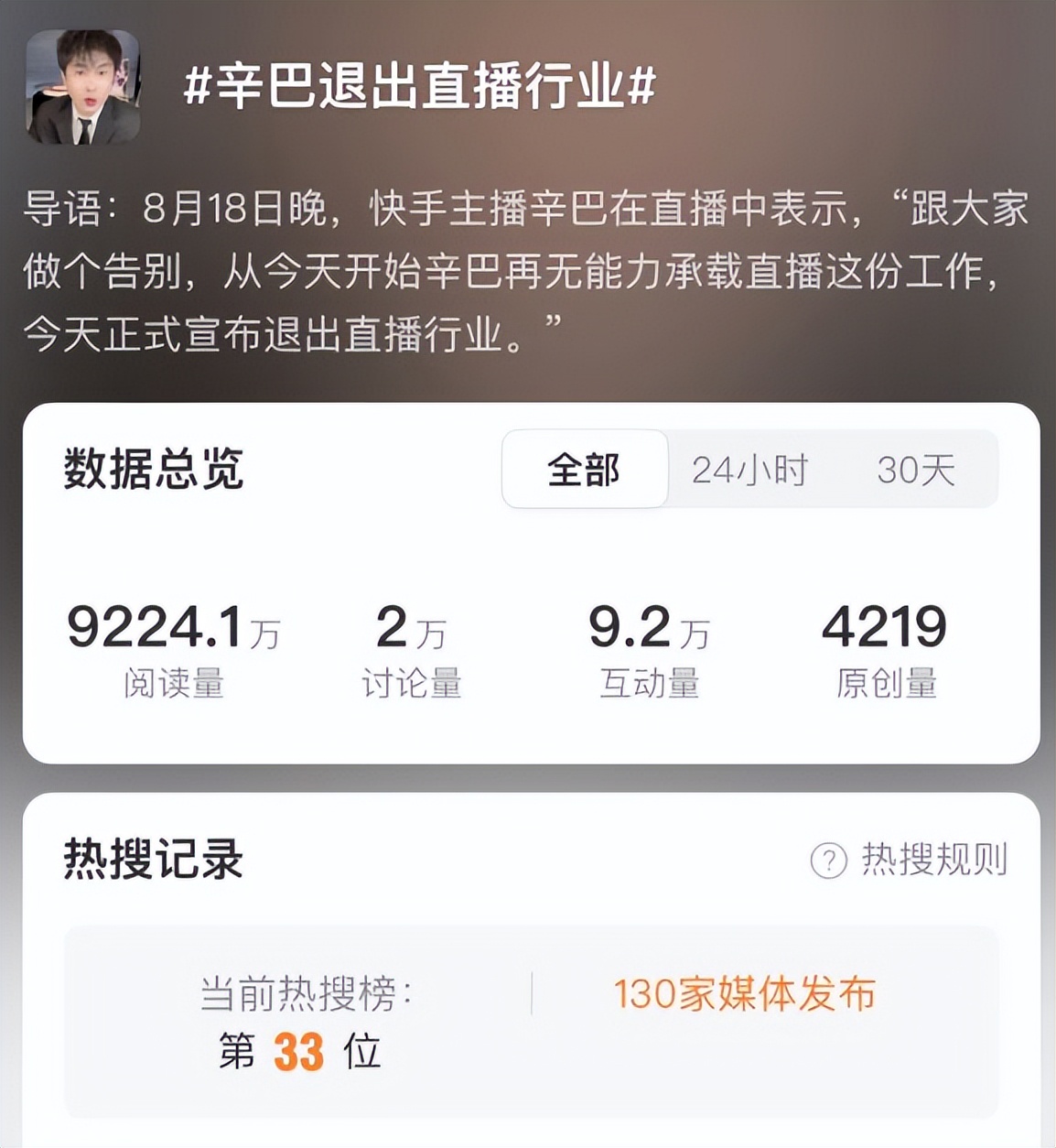 8月18日晚,快手主播辛巴在直播中表示,“跟大家做個告別,從今天開始辛巴再無能力承載直播這份工作,今天正式宣佈退出直播行業。”