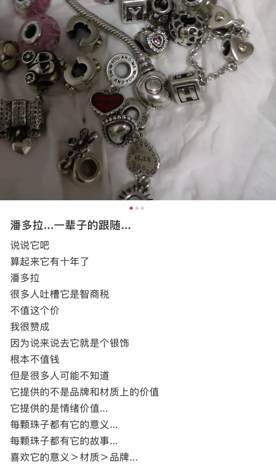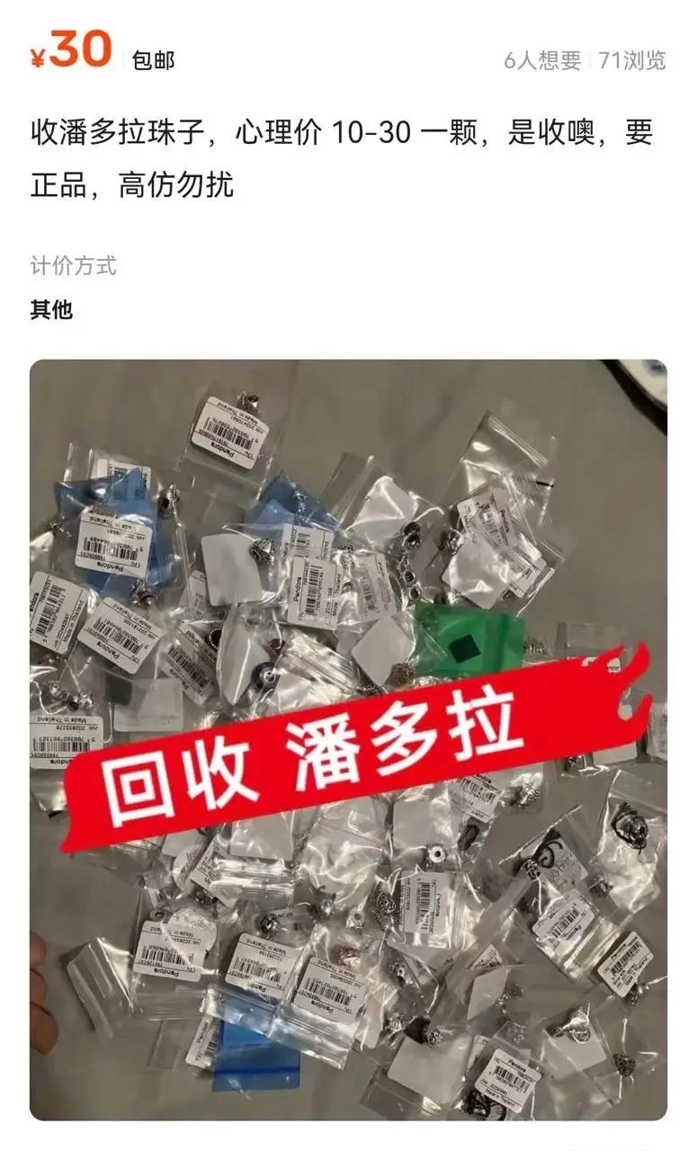 在二手平台上搜索“潘多拉手鍊”,僅有幾位用户發佈了回收潘多拉手鍊及串珠的筆記,回收價最低的在10-30元一顆(這些珠子當時售賣的價格為四五百元左右)