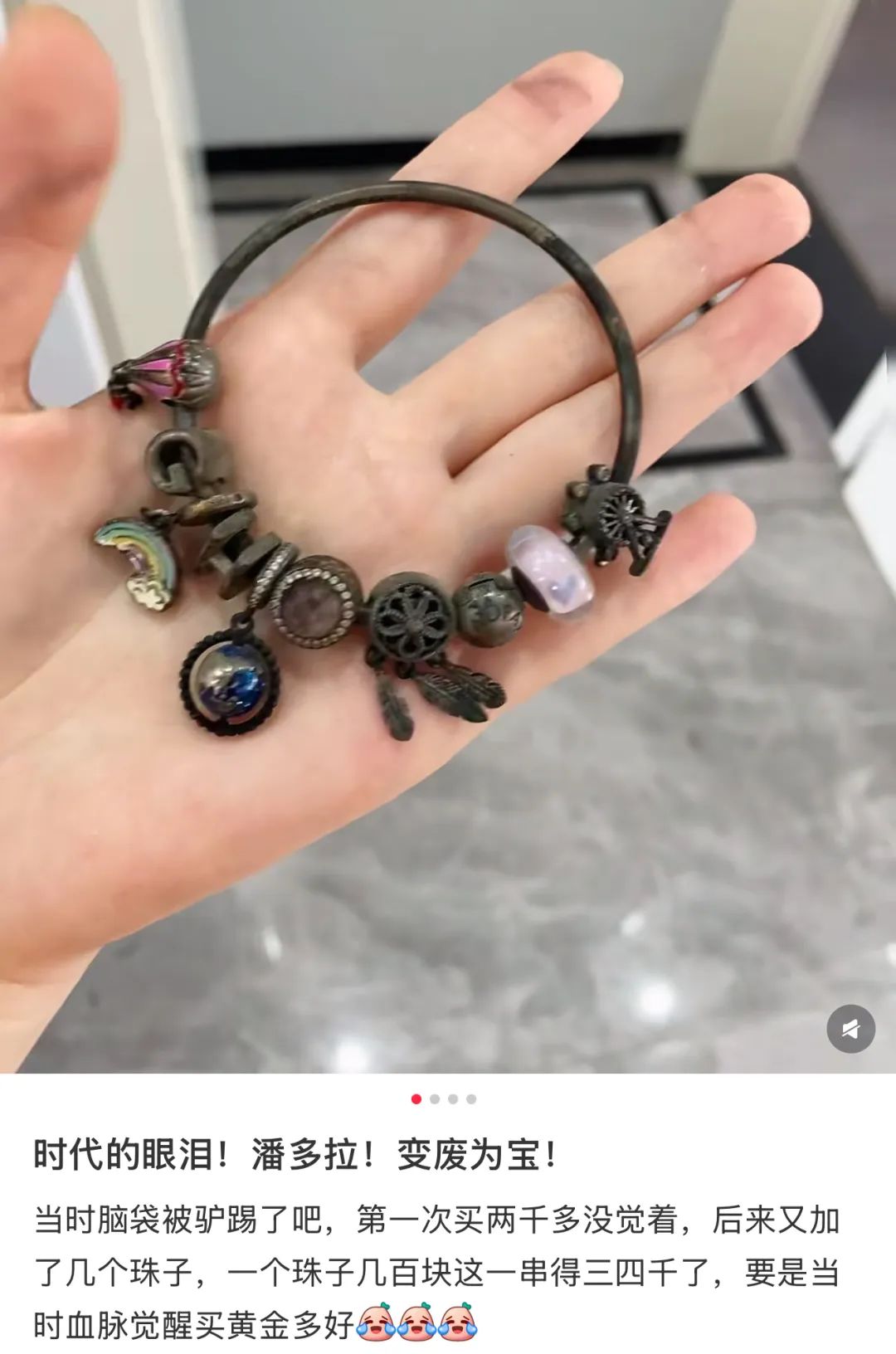 關於回收方面,一位回收二手奢侈品的商家表示,不收潘多拉手鍊,只收大牌飾品和金飾:“潘多拉現在回收的確賣不上價了,這種項鍊可能就是買一個品牌價值,用料都是合金、925銀、氧化鋯石和琺琅,戴到後面都是貶值的,還是黃金保值。”
