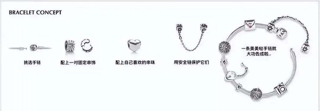 潘多拉最大的特點是“手鍊+串珠”的DIY產品模式,推廣語是“一顆珠子代表一個故事”,吸引消費者挑選品牌旗下各種造型的珠子來完成自由搭配。