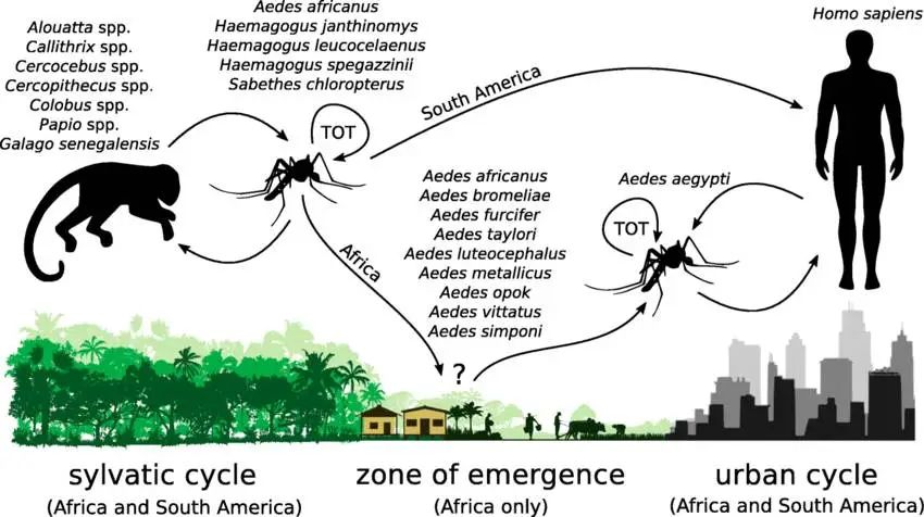 這張圖展示了黃熱病的傳播。黃熱病毒最早來自南美洲的雨林,它的宿主是當地的猴子,在流行病學上有兩個概念,一個叫森林循環,一個叫城市循環。左邊是森林循環,通過當地的蚊子在當地的猴子中間傳播。這個像個顏文字一樣的“TOT”是在蚊子之內的自動傳代。城市循環就是蚊傳蚊,然後蚊傳人,人通過蚊再傳人。