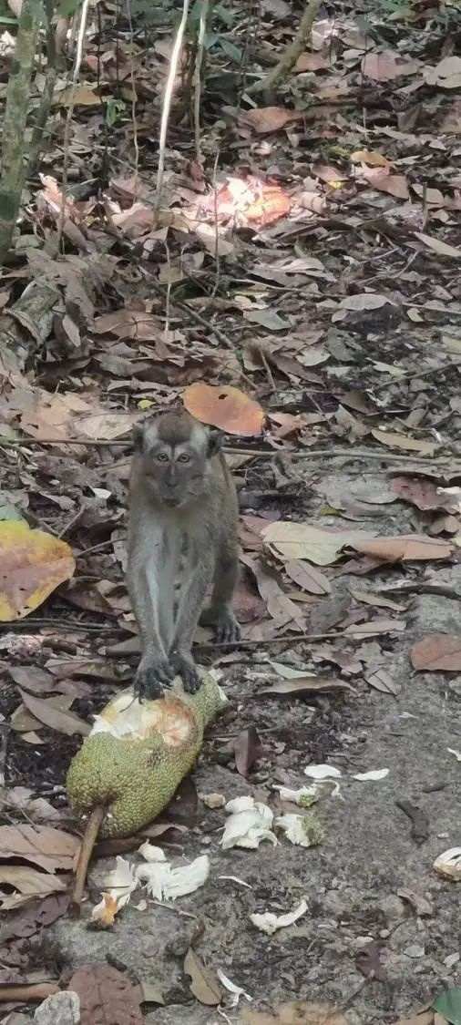 新加坡還有一些人類和野生動物常接觸的地方:比如過去是村莊的地方(當地叫甘榜)會栽培小菠蘿蜜(Artocarpus integer),它和菠蘿蜜都是菠蘿蜜屬,可好吃了,可以炸着吃,裏面甜甜的,外面酥酥的。小菠蘿蜜落到地上的時候,猴子就會過來吃,他們就會在城市公園和人相遇。