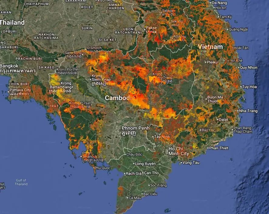 這張圖來自2013年發表在《科學》上的《21世紀森林覆蓋變化的高分辨率全球地圖》,這上面像火一樣的顏色是森林損失,顏色越紅表示森林損失的時間越近,越黃時間越遠。