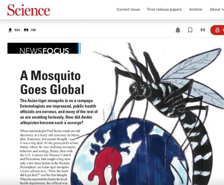 這是《科學》雜誌發表的一個漫畫,因為全球船運造成白紋伊蚊的入侵,人們擔憂“蚊子要征服全球了”。