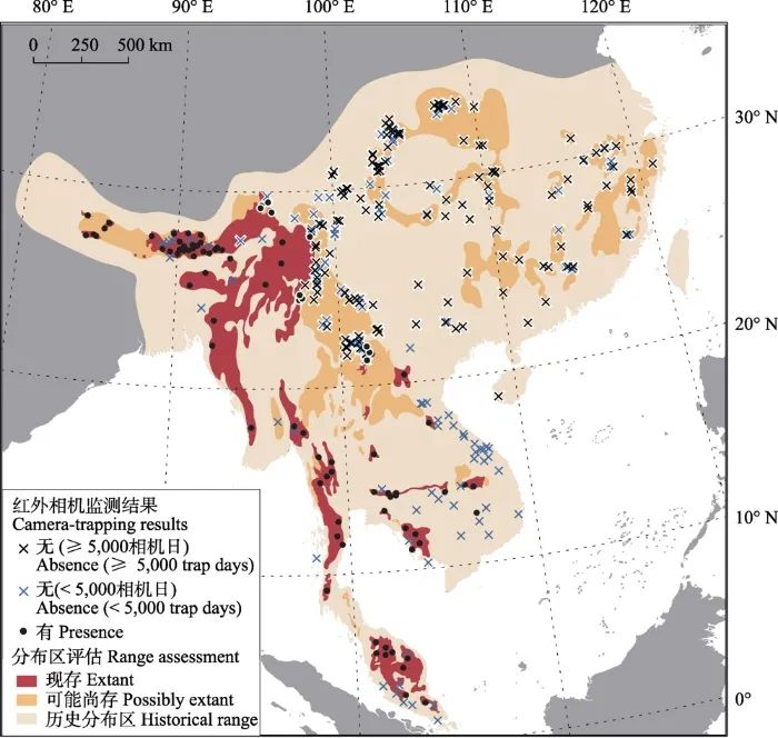 這張圖來自我在貓盟期間做的關於中國雲豹分佈的論文。這個圖上有標記的地方,代表貓盟和其他的科研單位在這裏放了紅外相機,這個圖裏面帶叉的地方都沒有發現雲豹,只有帶圓點的地方有云豹。在中國境內,這樣的地方不多了。
