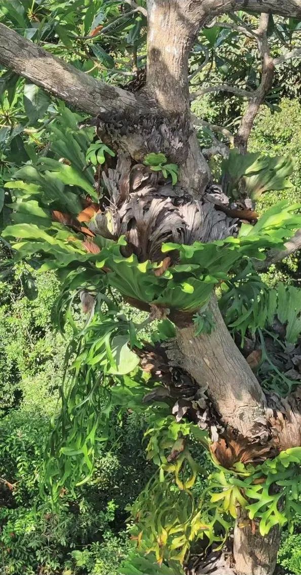 一些看起來平平無奇的植物,其實也有很多故事。這棵樹叫耳葉鳩漆(Campnosperma auriculatum), 它們是熱帶森林的先鋒物種,這棵耳葉鳩漆的上面有很多附生植物,其中這個叫皇冠鹿角蕨(Platycerium coronarium)。