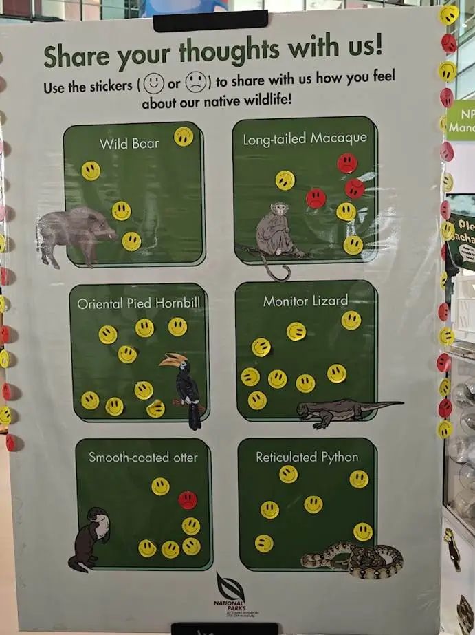 今年的新加坡本地生物多樣性節發起了一個投票,這些是新加坡城市公園能常見到的野生動物,你喜歡它就貼一個笑臉,不喜歡的就貼一個哭臉。可以看到人們對這個猴子很有意見,猴子經常進入居民區闖禍,確實是挺煩的。