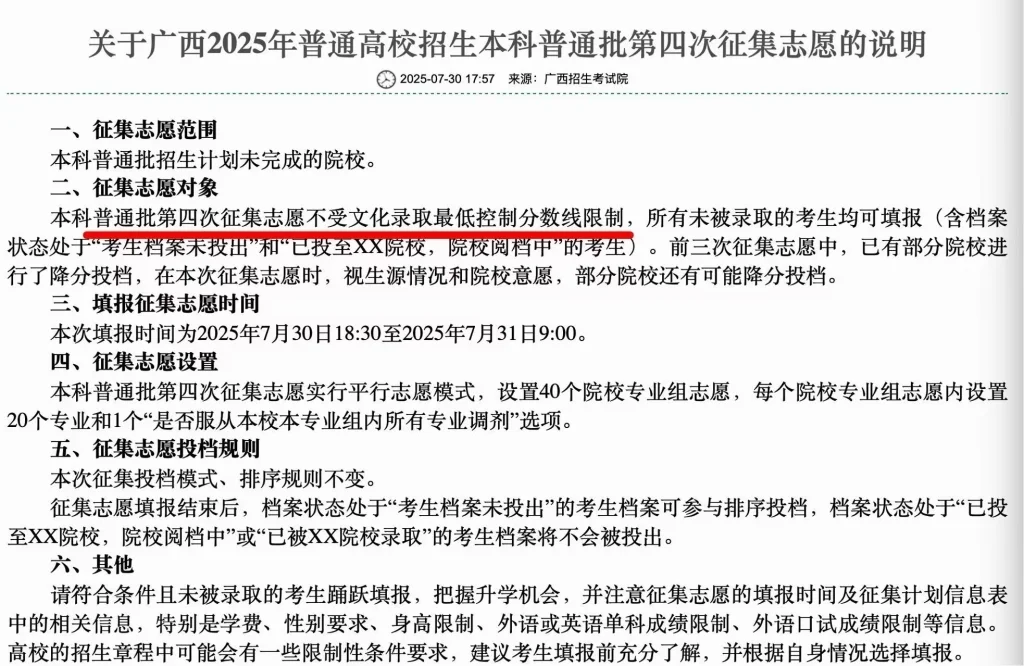 7月30日,廣西開始普通本科招生第四次志願徵集,且不受文化錄取最低控制分數線限制。來源:網絡截圖